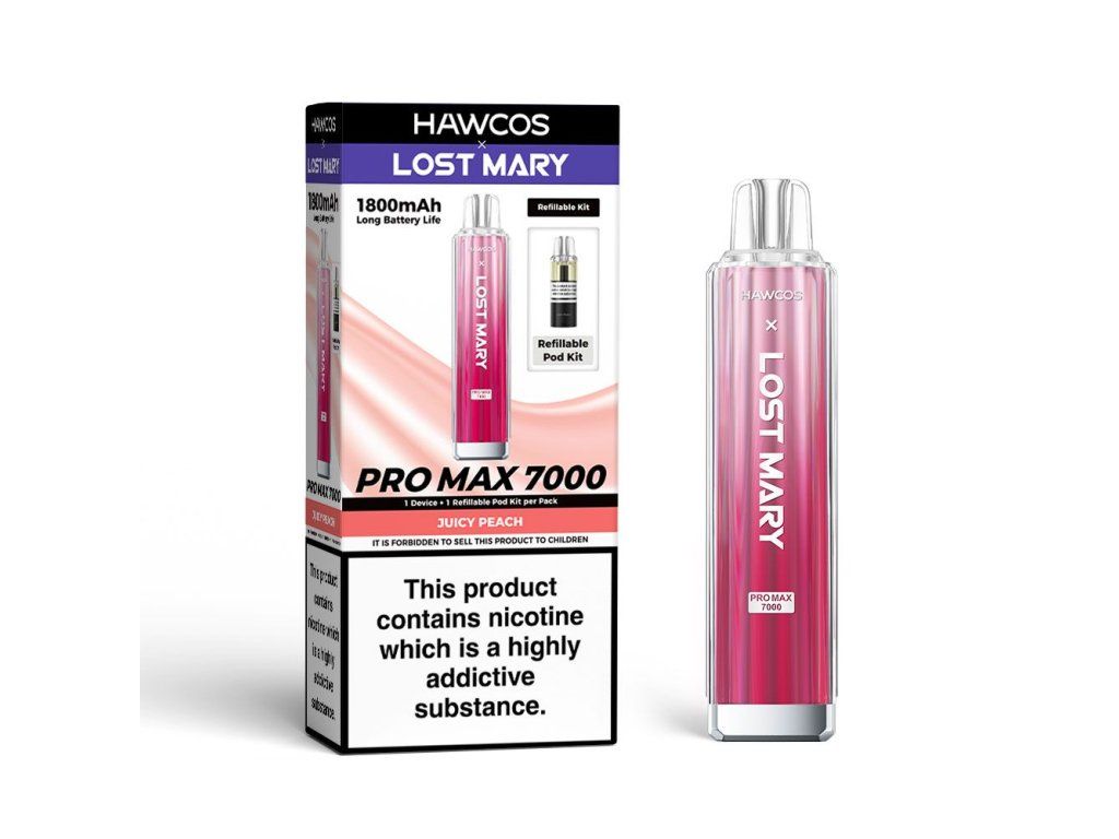 E-cigareta LOST MARY HAWCOS Pro Max 7K (ENG) 2ml|1800mAh|0.8Ω + E-Liq. s nik. soľou JUICY PEACH 10ml|20mg OC:16,90€
